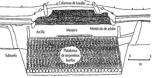 Por otro lado, los "pavimentos" son también depósitos subterráneos a menor profundidad que los anteriores, donde también se dispusieron toneladas de bloques de serpentina en forma de pavimento, sin formar un diseño abstracto como los primeros. La función y el simbolismo de estas singulares construcciones es desconocida, pero se deduce que su importancia es ritual y que posiblemente están asociados a la Madre Tierra. Dentro del montículo piramidal que limitaba el conjunto al Norte, se han descubierto algunas "tumbas". Dentro de la estructura A-2, se encontró una tumba que consistió de un recinto con paredes y techo formado por columnas de basalto, provenientes sin duda de las empalizadas mencionadas. Dicho depósito funerario contenía restos óseos deteriorados e incompletos de dos individuos jóvenes sobre una capa de pigmento rojo. Asimismo, se encontraron otros depósitos menos elaborados clasificados también como "tumbas", sin restos óseos, pero que por la disposición de los materiales asociados se interpretaron de esta forma.