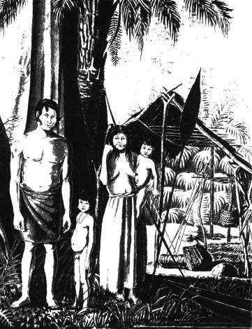 Figura 1. Família Guató em sua casa tradicional. Pintura feita
