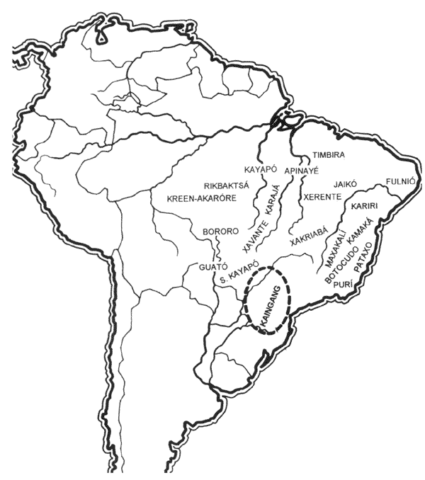 Os Kaingang habitam os territórios dos Estados de São Paulo, Paraná, Santa Catarina e Rio Grande do Sul. Segundo dados do ISA[ii] (1990) a população aproximada dos Kaingang é de 20 mil indivíduos, distribuídos em 26 Áreas Indígenas, administradas pela FUNAI (Fundação Nacional do Índio). Mesmo constituindo o ramo meridional das sociedades pertencentes ao tronco lingüístico Macro-Jê, este grupo não foi incluído nos estudos sobre os Jê desenvolvidos no "Projeto Harvard Brasil Central"[iii], coordenado por David Maybury-Lewis e que resultou no livro Dialectical Societies (1979).
