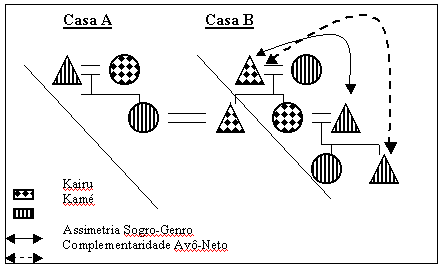 Como podemos observar no diagrama acima, a descendência patrilinear faz com que o grupo de mulheres da Casa seja formado por mulheres que pertencem a diferentes metades. O que caracteriza a relação entre estas mulheres pertencentes a metades opostas, entretanto, não é a assimetria, a complementaridade ou a afinidade, mas a consangüinidade e a solidariedade. Estas características podem transformar o status ritual das mulheres, caso elas recebam a marca das duas metades e se transformem nas auxiliares rituais, as pé~n - neste caso o grupo corporado residencial-consangüíneo determina certos padrões de sociabilidade que englobam as categorias dualistas rituais. De igual forma, os homens de uma Casa pertencem a metades opostas. Entretanto, devido à matrilocalidade a relação entre estes homens é marcada pela afinidade e expressa aspectos assimétricos (na relação sogro e genro) e complementares (na relação avô materno e neto). É certo que avô e neto são consangüíneos de metades opostas. Entretanto, ao contrário do que ocorre entre as mulheres, avô e neto não constituem um grupo corporado. No contexto da Casa, esta é uma relação temporária, a qual se transformará com o casamento do neto. No entanto, o avô é responsável pela educação e pela socialização do neto nos conhecimentos e contextos tradicionais, através dos quais o neto será preparado para sua experiência como um afim na casa de sua esposa.