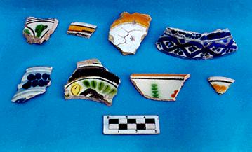 Figura 2.- Mayólica recuperada dentro de la torre. De izquierda a derecha arriba: Tipos San Luis Policromo, Abó, Aranama y Puebla Azul / blanco; Abajo: San Elizario y Loza poblana del Siglo XIX. (Fotografía del autor). |