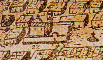 Figura 4.- El templo de Analco en un plano del siglo XVII, notándose una sola torre construida (Tomado de Vélez Pliego y Guzmán Álvarez, s/f, plano No.2) |