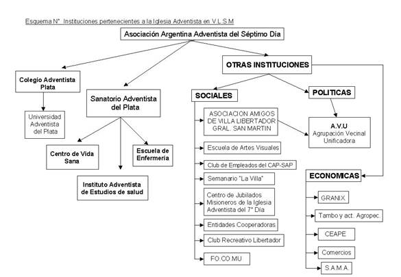 En el esquema N°1 nos muestra todas las vinculaciones de la Iglesia en la trama de relaciones económicas, sociales y culturales de Puiggari. Como podemos observar en el esquema, se podría decir que, la vida “social” del pueblo está organizada en torno a una serie de instituciones manejadas directa o indirectamente por la Iglesia. El Centro de Jubilados y Pensionados de la Villa que realizan fiestas anuales y cuyo objetivo se centra en “cultivar la fraternidad cristiana y colaborar con la marcha de la Iglesia”, es uno de los tantos espacios de reproducción de las relaciones sociales y culturales que se dan en el seno de las familias adventistas. Otro ejemplo claro es el caso del Club Social Recreativo Libertador creado en 1979, o Asociación Amigos de la Villa Libertador San Martín surgida en 1966 por iniciativa de un grupo de adventistas y con objetivos tan bien definidos como los de “favorecer la concreción de medidas de progreso, de convivencia, de embellecimiento y moralidad de acuerdo a los principios de la religión adventista” (Wensell, 1993). En sus primeros años, sin embargo, está entidad tuvo atribuciones bastante particulares, entre ellas, el control del crecimiento de la Villa de acuerdo a ciertas normas establecidas por su estatuto. Tuvo, en definitiva, una especie de control sobre el poder local hasta la creación del Municipio en 1971, sobre todo en lo que se refiere a la ordenación del espacio urbano. “Durante cinco años, la Asociación hizo en gran medida el trabajo de un gobierno local, impulsando la construcción de veredas de hormigón, interviniendo el trazado de nuevas calles, enripiando las calles principales a fin de poder transitar los días de lluvia y exigiendo el trazado de ochavas en las esquinas. Se dio el nombre a las calles, colocando los correspondientes letreros identificatorios”. [6]