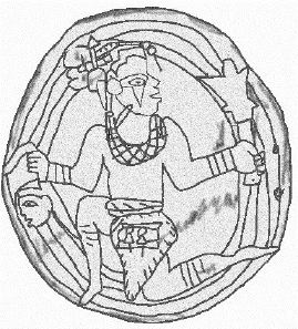 En el grabado en disco de concha de la cultura de Mississippi, América del norte del año 1200 al 1500 dne, Dibujo 2, se observa un decapitador con cuchillo ritual y cabeza de una víctima, asociada a la semilla que se entierra para germinar. Fue usado como pectoral por los habitantes de la zona de los Grandes Bosques, en la fase la cultura matriarcal de Mississippi / Misisipí. Se considera que la influencia mexicana es notoria (Barbier: 1997, 18).