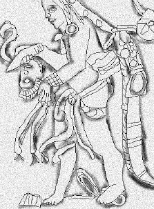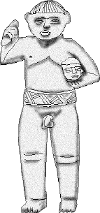 Otro decapitador con cuchillo ritual y cabeza decapitada de una víctima, asociada a la semilla que se entierra para germinar, se puede contemplar en la escultura de piedra volcánica de la región de Guapiles de Costa Rica, del año 800 al 1200 dne Dibujo 4.
