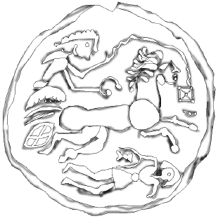 En los dibujos 5 y 6 se representa la figura de la Diosa Sena, pasando con su carro encima de una víctima muerta, su Hija la Diosa Galia, asociada a la semilla que se entierra para germinar. Están grabadas en monedas galas: una de los Vénetos y otra de los Redones de Aulerques, fechadas en el I milenio adne. Dramatizan metafóricamente la historia de la agricultura: la Diosa Sena recorre los campos llorando (lluvias) tras la muerte de Galia (semilla enterrada y muerta), ambas figuras simbólicas de la religión agraria.