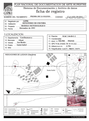 Es importante resaltar que estos registros llamados «clásicos», que intentan documentar las rocas, son muy imprecisos y lo que es más grave, se han venido reproduciendo de modo que se han multiplicado los errores sin que ningún investigador se detenga a estudiar sistemá-ticamente el lugar. Este informe sería el primer esfuerzo metodológico para corregir tal situación. Para que este proceso sea cumplido es primordial reseñar las transcripciones y denuncios anteriores y corregirlos. Las rocas incluidas en el modelo metodológico corresponden a las pictografías de Sibaté en la zona de San Benito, al oriente de la población (llamada tradicionalmente como Piedra de la Iglesia) y a una roca que se encuentra en el actual Parque ecológico de Poma (Los disparos), en la antigua región llamada de Tequendama.