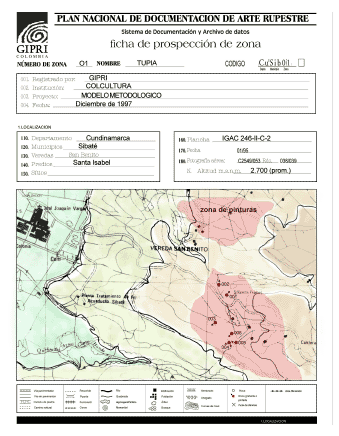 Esta zona, expresamente escogida por todas las razones anteriormente descritas, constituye un primer nivel dentro de la exposición del modelo metodológico dentro del capítulo de las descripciones de zonas estudiadas. Este es el lugar en el cual históricamente se inicia el denuncio de la presencia del arte rupestre (Conquista) y también es la zona en la cual se realizan los primeros levantamientos de sitios rupestres, producto de un trabajo de campo realizado por Miguel Triana a comienzos de siglo. La revisión de estos materiales es también un asunto esencial, como tema metodológico pues con esta investigación de Triana se exponen los primeros criterios y se construyen las primeras teorizaciones sobre el tema.