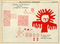 En la presentación hecha por Miguel Triana en el tercer Congreso Científico Panamericano de Lima en 1924, al igual que en la publi-cación tardía de su ponencia bajo el título El Jeroglífico Chibcha (Triana, 1970) , podemos ver las primeras teorías sobre los límites de las zonas rupestres y la tesis sobre las transformaciones formales de las representaciones rupestres. De igual modo, se pueden observar las planchas y los esquemas de sus interpretaciones. Según Miguel Triana, el proceso de representación debe iniciarse en las etapas más antiguas con las figuras naturalistas las cuales se van transformando en formas simplificadas, en trazos geométricos. Así la figura de la rana, que fue representada en sus características formales, análoga a la del animal, se fue lentamente metamorfoseando en distintas etapas por los artífices indígenas hasta llevarla a la selección de trazos simples, en rombos o en estructuras geométricas. .Sin embargo, las transcripciones publicadas en el jeroglífico constituyen sólo fragmentos de rocas y versiones muy precarias, que suprimen y geometrizan el original, lo cual ha venido creando nuevos problemas en la investigación y en el estudio del mundo estético. En este álbum, se recoge el trabajo gráfico de Miguel Triana, en la región central de país. Con el subtítulo Petroglifos de la Mesa Central de Colombia, se presentan 59 planchas de las siguientes zonas: