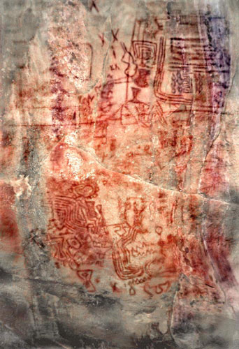 Roca de Tequendama Fragmento sector 3 Grupo 1,2,3 Cusuac03pi0015 Este panel esta severamente afectado por la humedad. La presencia de Caco3 ha venido haciendo imporsible reconstruir en detalle las particularidades de los trazos.