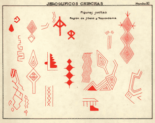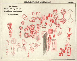 El texto de la Civilización Chibcha reseña en su capítulo tercero las Señales de la cultura mental, aspectos que ponen de relieve el carácter no accidental del lenguaje de representación de este grupo étnico, sus conocimientos naturales y sus elaboraciones intelectuales presentes en el arte rupestre. Aunque la ubicación de estas interpretaciones en la etnia Muisca presentadas por Triana resultan actualmente problemáticas, lo interesante es que en ningún caso se presentan estos hallazgos como asuntos desarticulados y casuales, y muy al contrario son expuestas como un ejemplo del alto grado de síntesis intelectual, producto de procesos evolutivos que van desde el naturalismo hasta la simplificación. Según Triana mientras se continúe pensando en que es más importante estudiar y soñar en el extranjero, será imposible desarrollar la cultura nacional. “La falta de aplicación a nuestro terruño hace que lo ignoremos como cosa extraña, cuyos disimulados pasadizos recorremos a tientas. No sabemos donde estamos ni para donde vamos y lo que es más sorprendente, no queremos conocer nuestro destino"(Triana, 1922). Este investigador se pregunta por las razones de la localización de las piedras pintadas en el territorio, e igualmente por la relación que puede existir entre la ubicación de los sitios rupestres y su correspondencia con los mitos y los flujos culturales presentes en los actuales departamentos de Cundinamarca y Boyacá. Llama piedras sagradas a los murales que él mismo en la mayoría de los casos visitó y determina como Jeroglífico Chibcha43 la manifestación de dispersos indicios de escritura, recogiendo de esta forma el intento de Duquesne, ahora en un nuevo nivel. Su investigación busca encontrar la relación entre los nombres de los pueblos y veredas, aquellas que conservan los vocablos Muiscas, producto de los posibles procesos de migración hacia el altiplano, correlacionando siempre esta ruta étnica con los lugares donde se sitúan las estaciones rupestres. Aquí son sin duda, patentes los esfuerzos por presentar la tradicional teoría difusionista, teoría que supone que cada grupo presente en el altiplano fue producto de invasiones.