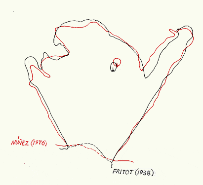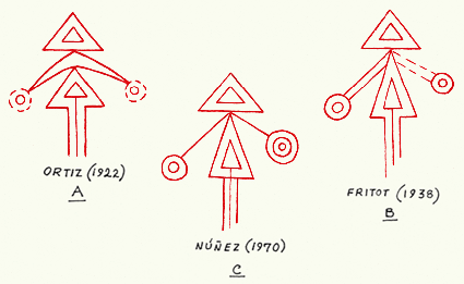 Es evidente que Núñez Jiménez ya no repara en las líneas dobles y paralelas que según Fritot y Ortiz parten del punto de incidencia de ambos triángulos dobles. El esquema de las sendas líneas que parten una hacia la izquierda y otra hacia la derecha ha sido el esquema seguido por los especialistas encargados de repintar el conjunto ideográfico y, por tanto, el resultado parece ser una clara alteración del signo inicial.