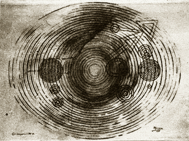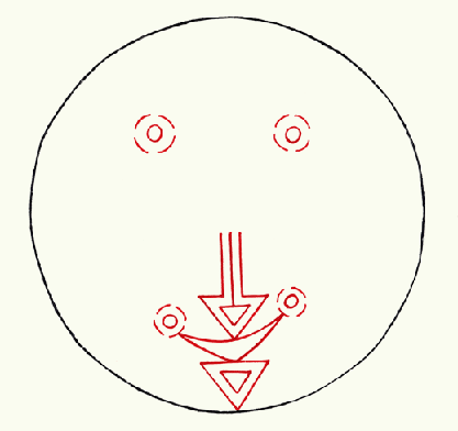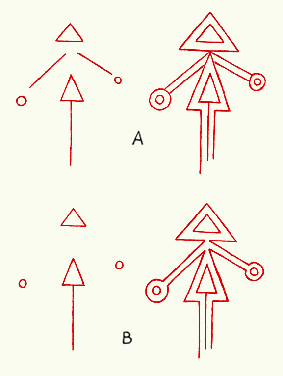 La posible existencia de dos pares de líneas paralelas que parten del punto de contacto de los dos triángulos dobles, hacia la izquierda y hacia la derecha, y que se integran a dos series de líneas concéntricas circulares que se encuentran a ambos lados (norte y sur) del triángulo medio, enfatiza el elemento simétrico del dibujo -al que antes me refería-, así como cierta dinámica direccional. Dos principios esenciales se ponen de manifiesto entonces: el sentido simétrico y el direccional.