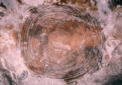 El resultado es la alternancia en la elipse de trazos circulares concéntricos del tipo de relación (1 x 1), o sea, 28 rojos y 28 negros, mediando entre ellos igual número de líneas blancas. Logra, además, equilibrio en la figura a partir de un punto único, origen del crecimiento del mismo y crea la sensación, debido al orden geométrico -rítmica de sus trazos-, de infinitud del espacio cerrado y contenido en el círculo. Al mismo tiempo se crea una dinámica expansiva tendiente a romper su cerco ovalado y a difuminar un sinnúmero de líneas, dominando todo el espacio rocoso.