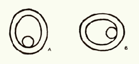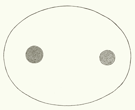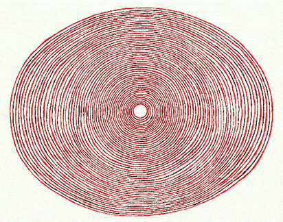 Sin embargo, cuando me propuse reproducir series de líneas concéntricas circulares, sin la ayuda de ningún instrumento de precisión, a la manera que originalmente -presumo- se hayan realizado, descubrí que a medida que me alejaba del círculo medio se hacía más fácil el trazo circular, siempre y cuando respetara la equidistancia al trazo anterior. Esta situación me hizo pensar que, posiblemente, la transformación paulatina de trazos circulares a trazos elípticos haya sido objeto de un criterio selectivo: quizá, la consciente búsqueda del signo elíptico, a manera de efigie, fuese la causa del cambio.