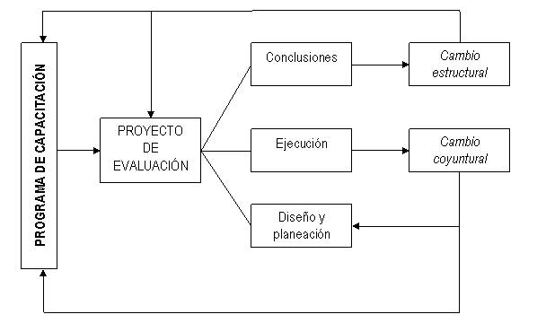 Del programa de capacitación se crea un proyecto de evaluación que en sí mismo contendrá tres etapas: el diseño y planeación, la ejecución del mismo y al final las conclusiones. El proyecto de evaluación nos dará elementos para poder hacer los cambios necesarios para el mejoramiento del programa. De esta manera, en la etapa de la ejecución, en base a los datos que se van presentando se pueden hacer cambios coyunturales, esto es rectificar o modificar acciones tanto del diseño de la evaluación, como del desarrollo del programa de capacitación, esto, para poder cumplir de la mejor manera los objetivos y metas propuestos en la curricula, por lo que dichas modificaciones son sólo en cuanto a las estrategias que se desarrollan durante el programa y que se pueden hacer durante el desarrollo del mismo.