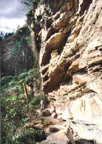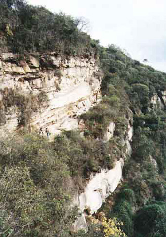 La formación geológica pertenece al terciario (Formación Guaduas) y el yacimiento corresponde a sedimentos de ambiente lagunar y marino. Se encuentran areniscas y arcillolitas y conglomerados cuya consolidación es variable y baja. Al parecer las pinturas fueron realizadas por la técnica dactilar en la mayoría de los casos, sobre una superficie muy inestable, lo cual a hecho que en algunas partes del mural varios dibujos se encuentren en zonas de una mayor humectación produciendo desgastes y cambios al punto que algunas figuras que originalmente fueron blancas al alterarse adquieran colores amarillosos o cafés. Las bandas de la estructura sedimentaria del mural y el nivel de consolidación de cada una de éstas también influyen en el estado en que se encuentra la pintura, que por lo general, no se incorporó al sustrato, lo cual ha generado un grado alto de pérdida de la capa pictórica. Resulta sorprendente que se haya utilizado este yacimiento al tiempo que un pigmento que parece también igualmente inestable, en relación a superficies mucho más consolidadas y a pigmentos mas estables, como aquellos que tradicionalmente se usan en todo el territorio del altiplano y que se encuentran en óxidos ferrosos (rojo) en pinturas en los alrededores de este lugar. Incluso los campesinos de la zona recuerdan haber visto las figuras como mayor resolución; nitidez que ha venido desapareciendo, avance del deterioro del pigmento y del sustrato ,que según sus comentarios, hace pensar que la velocidad en la destrucción del sitio es alta. Desafortunadamente no existen estudios químicos sobre el pigmento, ni tampoco un monitoreo permanente sobre el lugar. No todas las zonas de este emplazamiento se encuentran afectadas del mismo modo, algunas cornisas y techos están relativamente protegidas de la humedad, del viento y del acceso humano, lo cual permite que ciertas formas se encuentren en relativo estado de conservación. Escurrimientos diversos en 45% que humectan la roca, fracturas de las bandas del sedimento, descamación y carbonatos en un 70% hacen que el mural haya sido afectado en la pérdida de su capa pictórica en un 60%. La presencia de material orgánico en el techo del yacimiento hace que la humedad no controlada fluya deteriorando una basta cantidad del total general de los 50 metros del yacimiento. Actualmente se realizan algunos trabajos de corrección fotográfica que han permitido, con diversos procedimientos, resaltar aun mas los pigmentos blancos desaturando los colores que se encuentran en fotogramas de alta resolución producidos en la expedición que origina este informe.