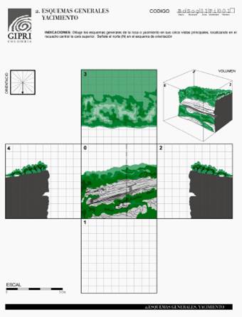 Ficha de Esquema general del Yacimiento. Se muestran las diferentes caras del abrigo, y una versión que reconstruye el ambiente volumétrico del lugar. Fotografía de la vista general del abrigo.