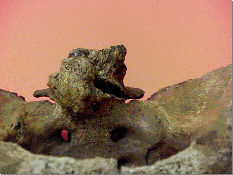 · Disfagias por compresiones. Las compresiones hiperostósicas no sólo afectarán al esófago ya que éste se inicia en C6. Pueden haber producido dificultades en la intubación. Las hiperostosis cervicales más altas producen disfagia por desplazamiento de la pared de la hipofaringe y de la laringe en el fondo de la cual aparecen como una protuberancia. La disfagia puede haber sido leve o progresiva, con dificultades a la deglución, dificultad respiratoria, y pérdida de peso [[35]]. Tiene como característica especial que empeora con el cuello en extensión y la postura que adoptaba en vida era la de flexión para mejorar la disfagia. Las disfagias producidas por osteofitos se caracterizan por la afectación discal concomitante [[36]]