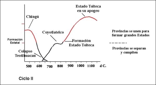 El desarrollo del estado teotihuacano en el altiplano central, fue un proceso previamente desconocido, y su consecuente colapso, creó condiciones para las formaciones estatales más tardías. El ciclo II describe precisamente este momento de incertidumbre en las organizaciones sociopolíticas del área de Tula tras la caída de Teotihuacan. Consiste de dos partes, el primero compuesto de unidades políticas múltiples, pequeñas e independientes, en tanto el segundo se caracteriza por la existencia de grandes estructuras políticas integrativas.